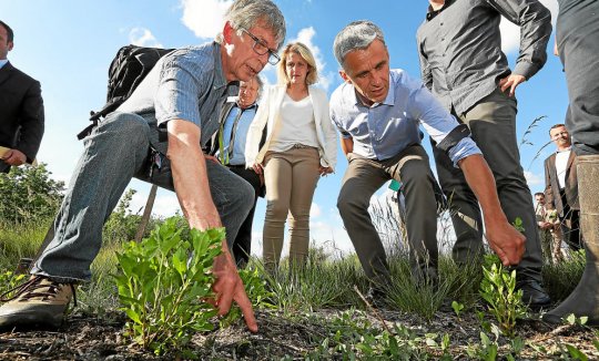 Daniel Lasne (à gauche), appuyé par Luc Foucault (à droite), a expliqué à Barbara Pompili (au centre) les techniques mises au point par le collectif pour lutter contre le baccharis. (Photos François Destoc)