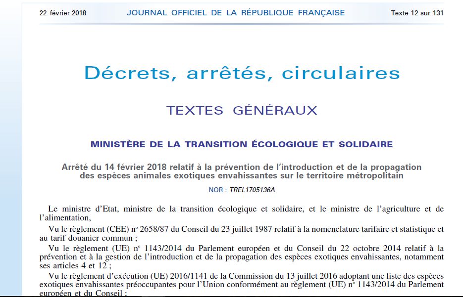 Cet arrêté rend applicable l’interdiction d‘introduction dans le milieu naturel, qu’elle soit volontaire, par négligence ou par imprudence, des espèces listées.